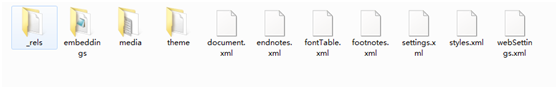 docx 格式文件的主要内容是保存为XML格式的,但文件并非直接保存于磁盘。它是保存在一个ZIP文件中,然后取扩展名为docx。将.docx 格式的文件后缀改为ZIP后解压, 可以看到解压出来的文件夹中有word这样一个文件夹,它包含了Word文档的大部分内容。而其中的document.xml文件则包含了文档的主要文本内容